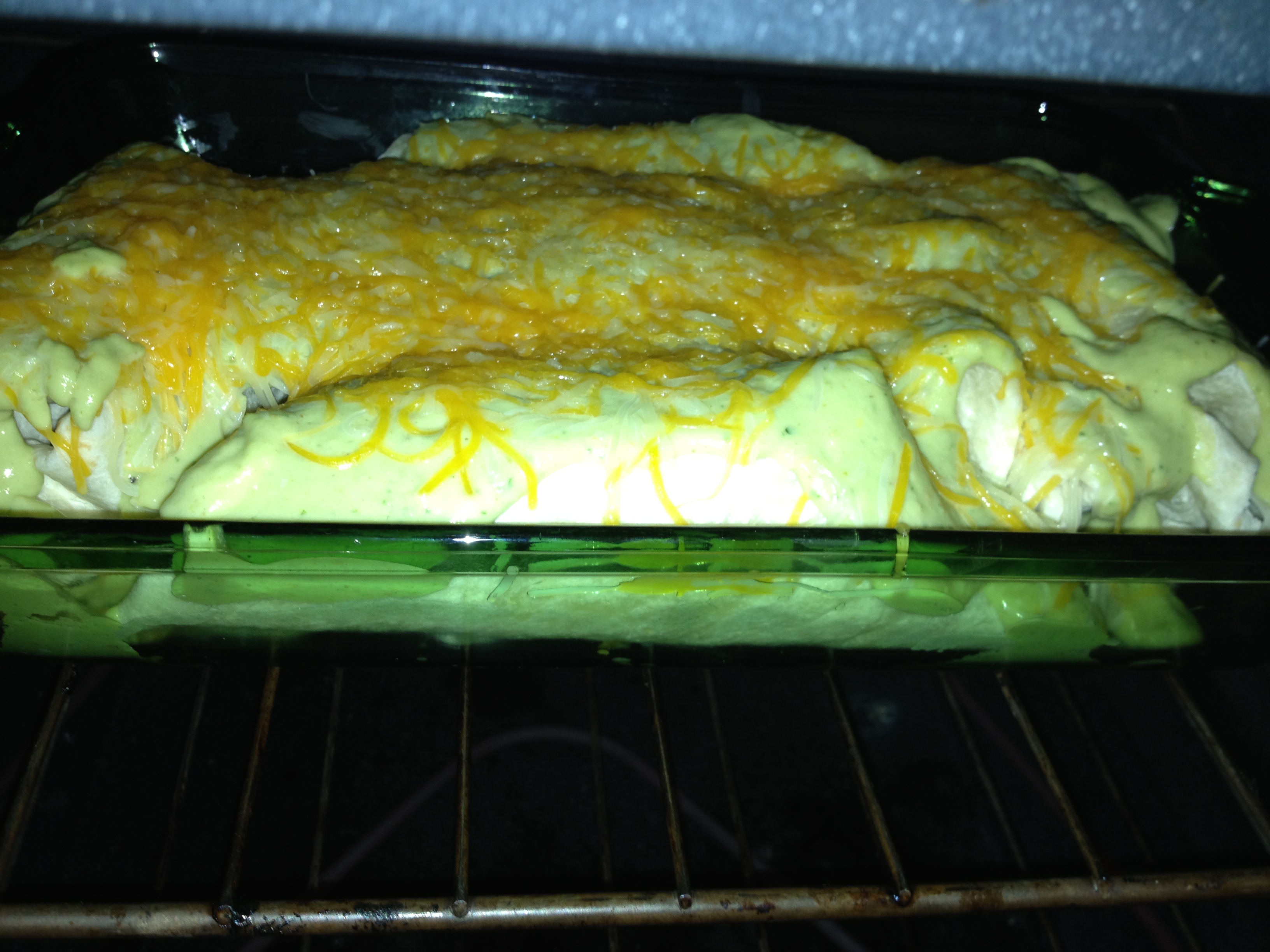 Fill tortillas and place in a glass pan. Pour the rest of the sauce mixture over the enchiladas and sprinkle the top with the rest of the cheese.
