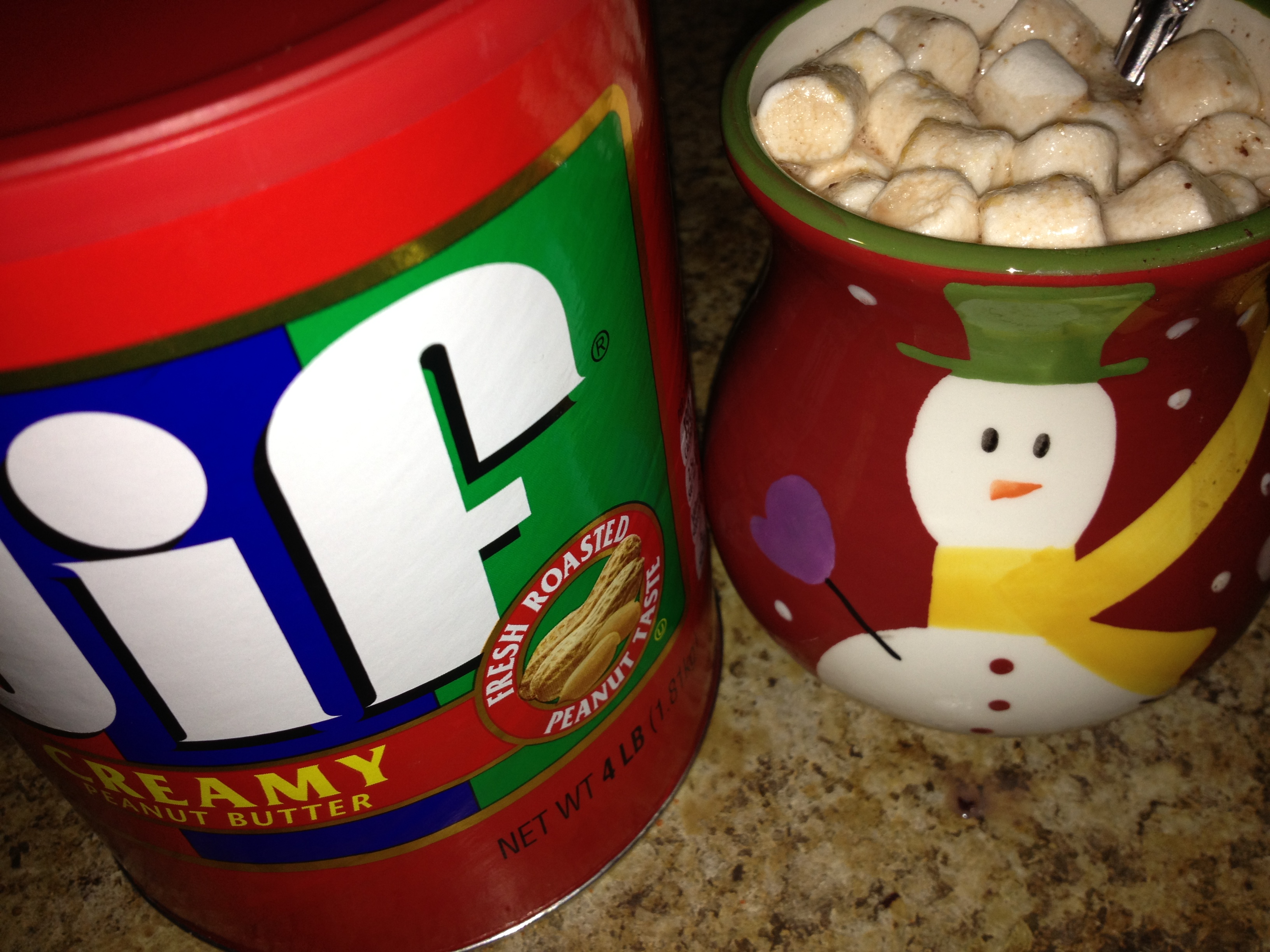 What I appreciate about hot chocolate is that I can make some with milk and mini marshmallows for only 4 points on Weight Watchers. And I never eat more than my 10 marshmallows! (They are 0 points so that means if I have 20 that is still 0 right??) I had been thinking about throwing some peanut butter in with my hot chocolate and when I finished warming my milk I decided it was the right thing to do.