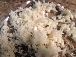 Preheat the oven to 450 degrees. Cut the cauliflower in about 6 pieces that are large enough to grate without ripping your fingers off! I wish I woud have had that instruction the first time I made it because I had cut it up too small and did manage a few snags…ouch!