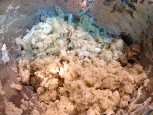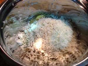 - After the cauliflower cools off, add the eggs, cheese, chopped fresh garlic, oregano, and onion salt.