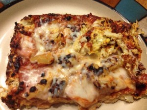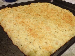 After thoroughly mixing the ingredients pick up handfuls at a time and squeeze as much moisture out as possible. (I am debating using 1/2 cup mozzarella cheese and 1/2 cup grated parmesan next time to dry out the crust a little) Spray a cookie sheet or pizza pan and spread the mixture out until you form a pizza crust. Sprinkle grate parmesan on top before putting in the oven for 15 minutes.