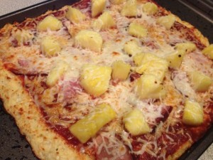We used some smoked ham that we had left over from the Trager which worked beautifully. Put as much sauce as desired on your crust topped with 1/2 cup mozzarella cheese. Then top with the meat and pineapple. Finish off with one last sprinkle of the rest of the 1/2 cup cheese that is left. Give the whole pizza a spray or two of cooking spray right on top. Put in on broil for 2-3 minutes. WATCH IT CAREFULLY! The first round I spent 15 minutes salvaging the cheese because it burnt the top layer good. This was my first time using the broiler on the oven so it was a learning experience for sure! It gets HOT HOT HOT! The second time I made this I turned the light on in the oven and sat there and starred at it until it looked like it was ready to go!