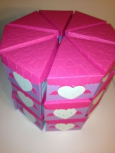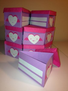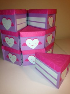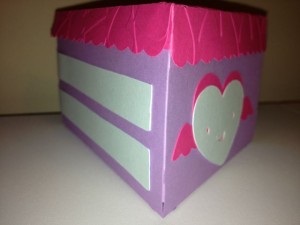 So the second I got a Cricut I was sure to order the Sweet Tooth Boxes Cartridge to make a paper cake for my kiddos for Valentine’s Day! The hardest part was figuring out the measurements. I set the base of the cake slices at 8 inches. If you use Cricut Craft Room, there is an option in the layers tab to make the lid transparent so you can line up the folding edges so that the lid fits. I tried finding exact measurements but it seemed as though no one had mentioned any measurements in the blogs that I had come across on Pinterest or YouTube. It seems like for these types of Cricut projects you almost have to play around with them before you cut a bunch out. Once I matched everything up I used a heart with angel wings from the Create a Critter Cartridge.