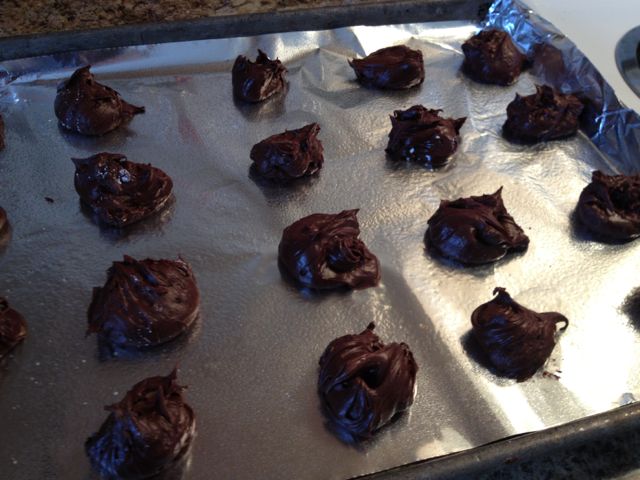 Preheat the oven to 350 degrees.  Melt the bag of chocolate. (You can keep a half a cup on the side to use for chips in the cookies if you wish)