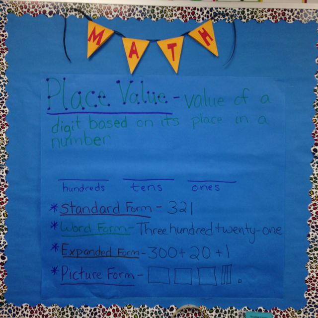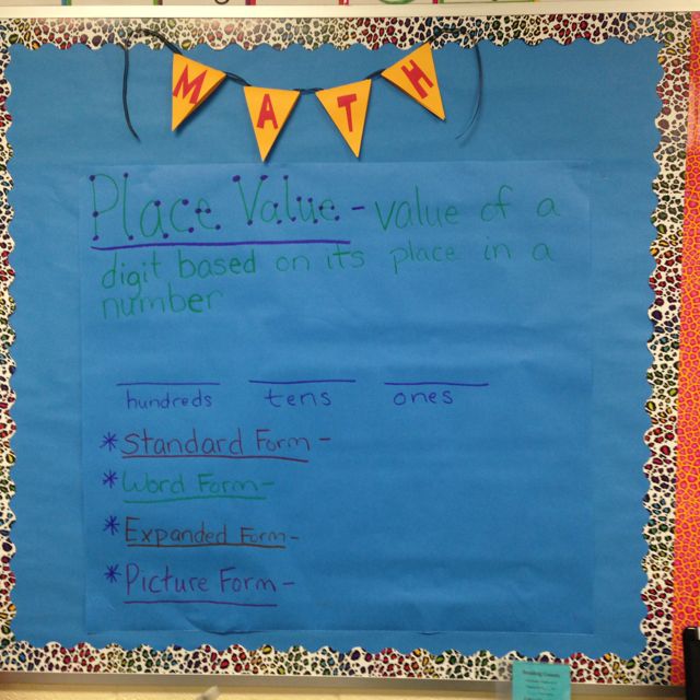 The blue bulletin is dedicated to math. I had vocabulary cards on a pocket chart for my Math board right when school started.I made this on my plan time just to get it set up nicely before class started.We filled out the anchor chart while discussing the different forms to show a number.