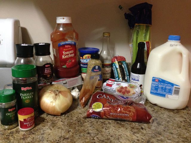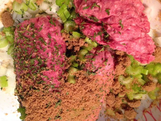 Whisk together eggs, milk, and Dijon mustard. Add breadcrumbs and let sit while you mix up the meat mixture. In a large bowl, combine onion, garlic, celery, parsley, thyme, majoram, salt & pepper to taste. Add the ground pork and ground beef and mix thoroughly with hands. After meat mixture is combined, add the egg mixture and finish mixing.