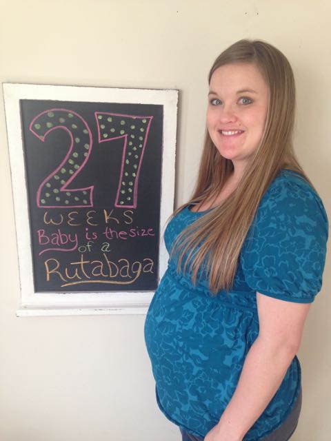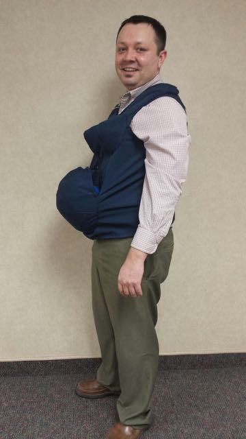 27 weeks this week! I am really starting to feel those swollen feet!Alex sporting the “sympathy belly” at our childbirth class. He said it really pushed on his bladder! Well at least they made them feel a part of it!