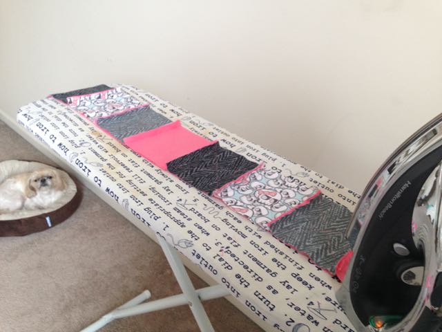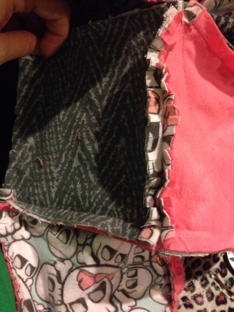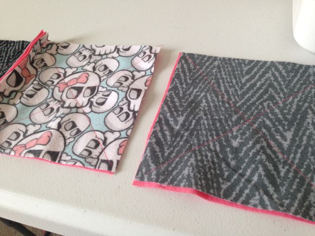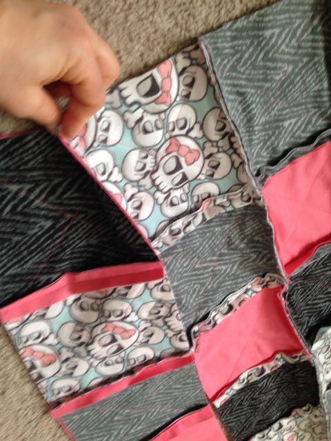 Now when I purchased the material, I only got 1 yard of each, because I was thinking I was just going to make a strip rag quilt. After I got home, I decided to challenge myself and do the square quilt. Since you cut the sides of each square all the way around, this was going to shorten my blanket quite a bit. I went back, and of course I could not find the black and gray chevron anywhere. I did find a gray chevron that was the same, just a much lighter shade. I ended up getting another yard of the skulls and pink flannel and one of the gray chevron. I probably could have got away with 1 1/4 yard of each material since I did 4 different fabrics.