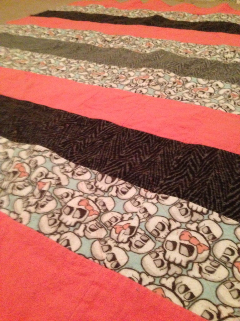 Now you do your rows the same as your squares. Make sure you get the raw side up. If you pinch them together like this, it will help you remember!I make sure to pin it good. This will help your rows not shift as you are sewing. I have my bottom sides together and pin all the way down.Once you get all the rows sewn together, make sure to square up the sides with your rotary cutter. Then starting at one side, sew a 1/2 inch seam all the way around the blanket pivoting at the corners.Now you need to get really friendly with your scissors. I usually would watch tv while I was doing this because it takes FOREVER. The result is worth it though, I promise!Do the same thing around every square.Once you have cut all your raw edges, it is time to wash! My grandma recommends to use a color catcher when you wash just in case your material bleeds. It would not be fun to ruin all that hard work!After you wash and dry the quilt, you will have to spend some time getting the pills off with a lint roller. I have gone through an entire lint roller on these blankets before. It is not fun, but once you are done it is totally worth it!Here is the back of my quilt! I am still in love with these skulls with bows!