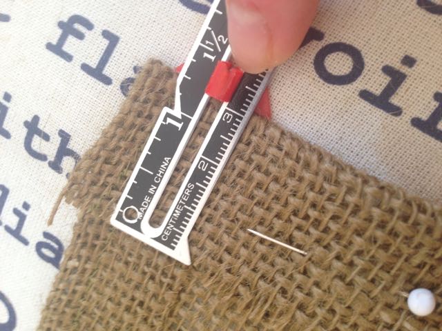 Using a seam gauge, pin and iron the long sides of your burlap at 1".  On the bottom part of the flag, pin and iron with a 3/4" seam.  Leave the top part alone for now.  Sew a 1/2" seam allowance using a zigzag stitch starting on the right long side and pivoting around the three pinned sides of your burlap.