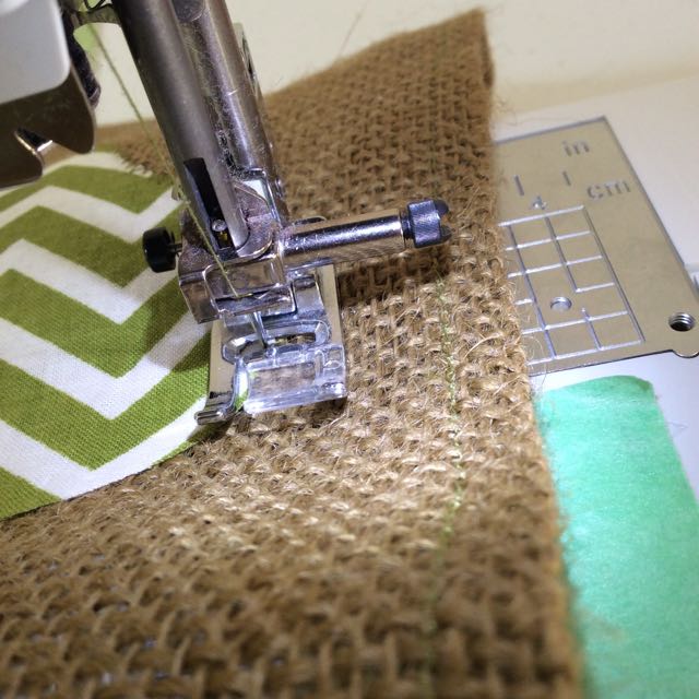 Using a seam gauge, pin and iron the long sides of your burlap at 1″.  On the bottom part of the flag, pin and iron with a 3/4″ seam.  Leave the top part alone for now.  Sew a 1/2″ seam allowance using a zigzag stitch starting on the right long side and pivoting around the three pinned sides of your burlap.