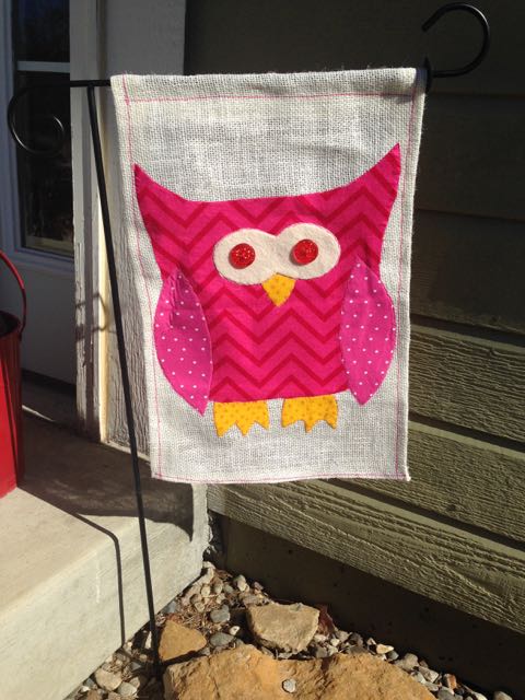 Position the piece however you would like it on your flag and iron it down.  Now get to your sewing machine and set your machine to a zigzag stitch.  Using the middle of your presser foot as a guide, zigzag around the entire applique slowly making sure that the stitch goes right on the outside of the applique.  Make sure to take your time.  I went much slower on this one as my owl on the last flag was not as neat as I would have liked it to be.