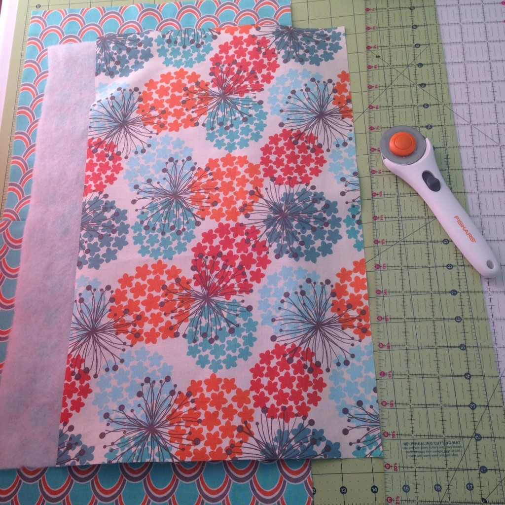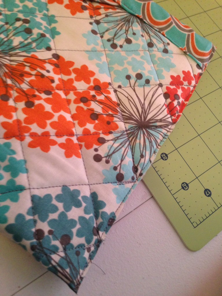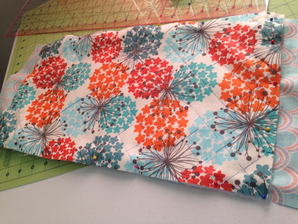 Sandwich your fabrics together with the liner fabric right side facing down, then the batting, then the outer fabric right side up.  You have to make sure to line the batting and outer fabric to where there is 1 3/4″ on each side.  Then pin in the corners.