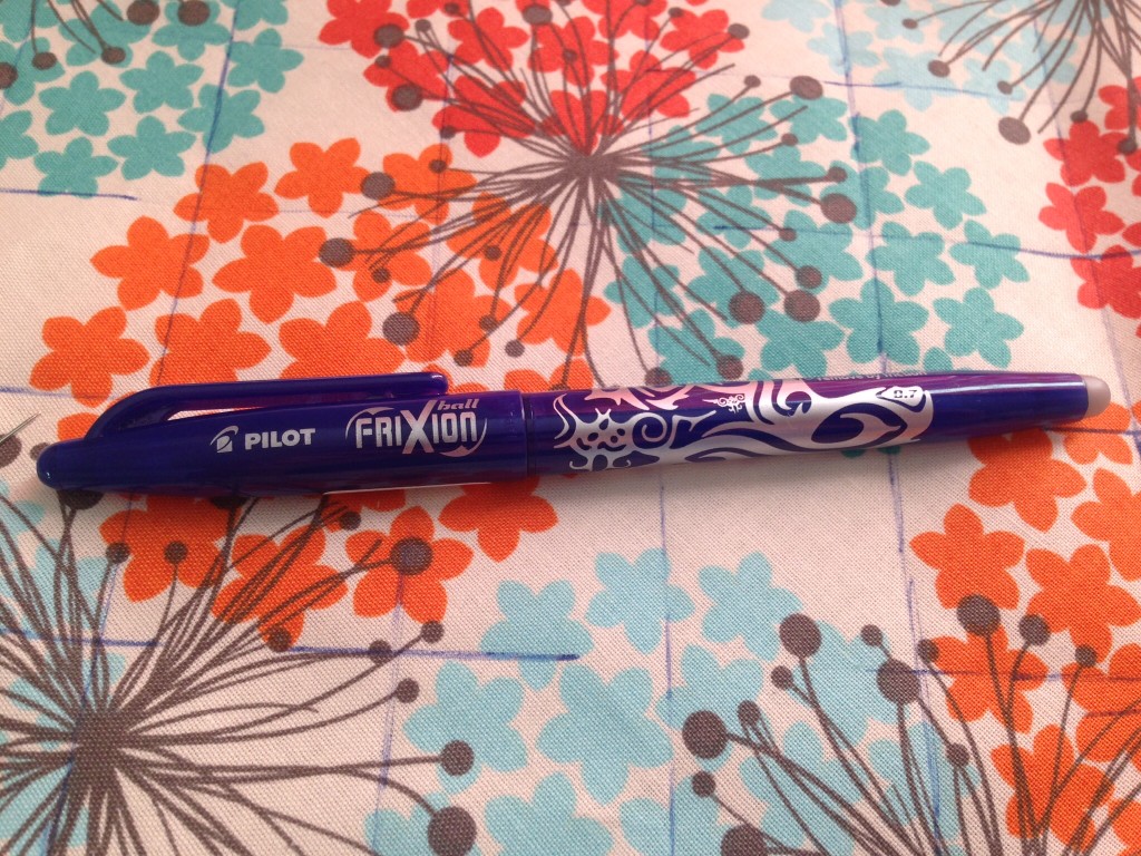 I used this AMAZING pen by Pilot called the Pilot FriXion Ball Gel Pen that my grandma gave me.  It goes on like a regular pen and disappears with the iron!  After you get your lines drawn, pin down the sides like crazy so it doesn’t shift on you.  Make sure to backstitch at the beginning and end of each line!