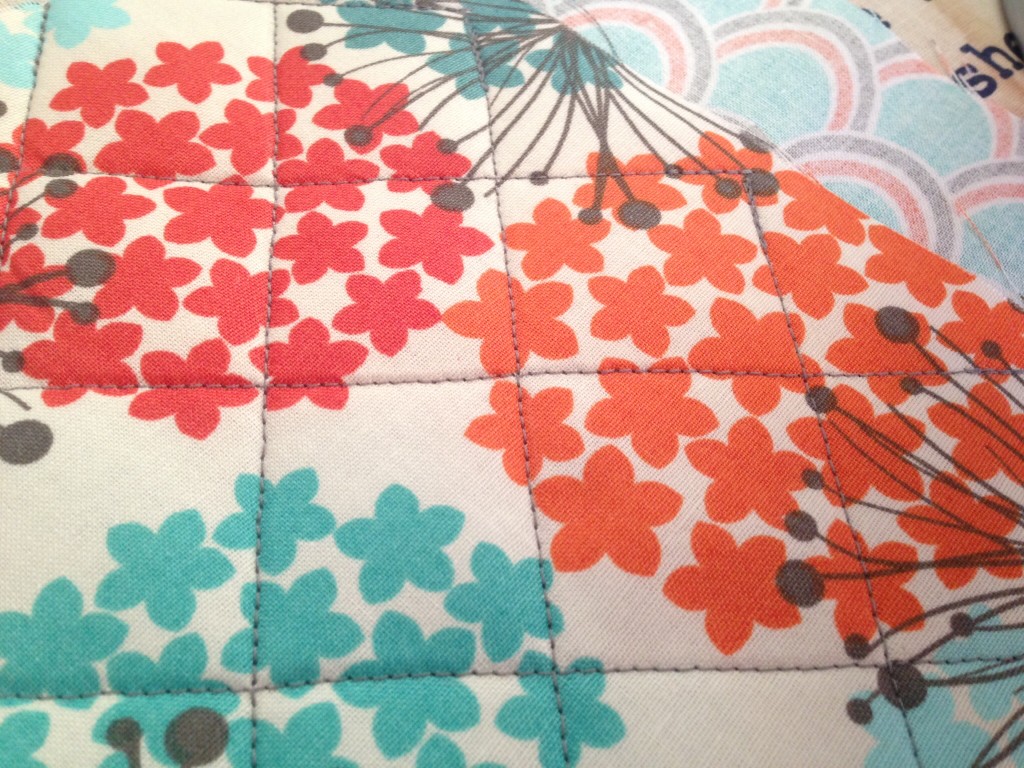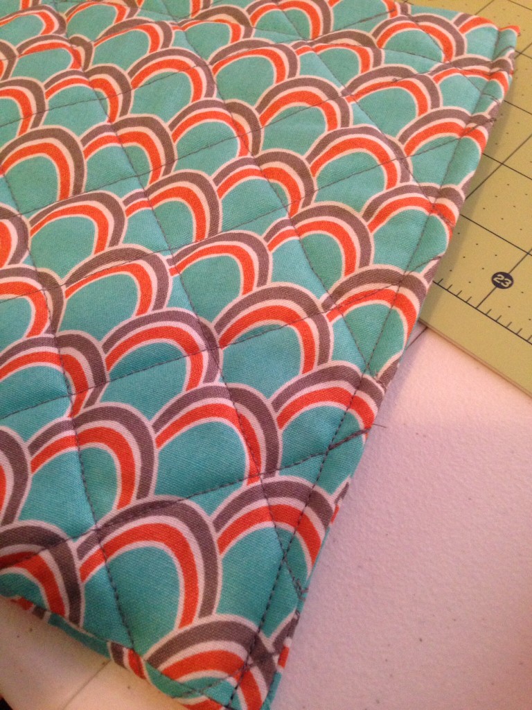 Now you need to quilt the pieces together.  Make sure that they are at least 2″ apart.  You can do a closer crisscross if you do every inch as well.  After measuring 2″ along all four sides, you will need to start connecting them.  When I connect them, I make sure to leave about 1/4″ on each short side, otherwise the stitching goes up on the casing when you are finishing your bag.  On the long sides, you can draw them to the end of the fabric.