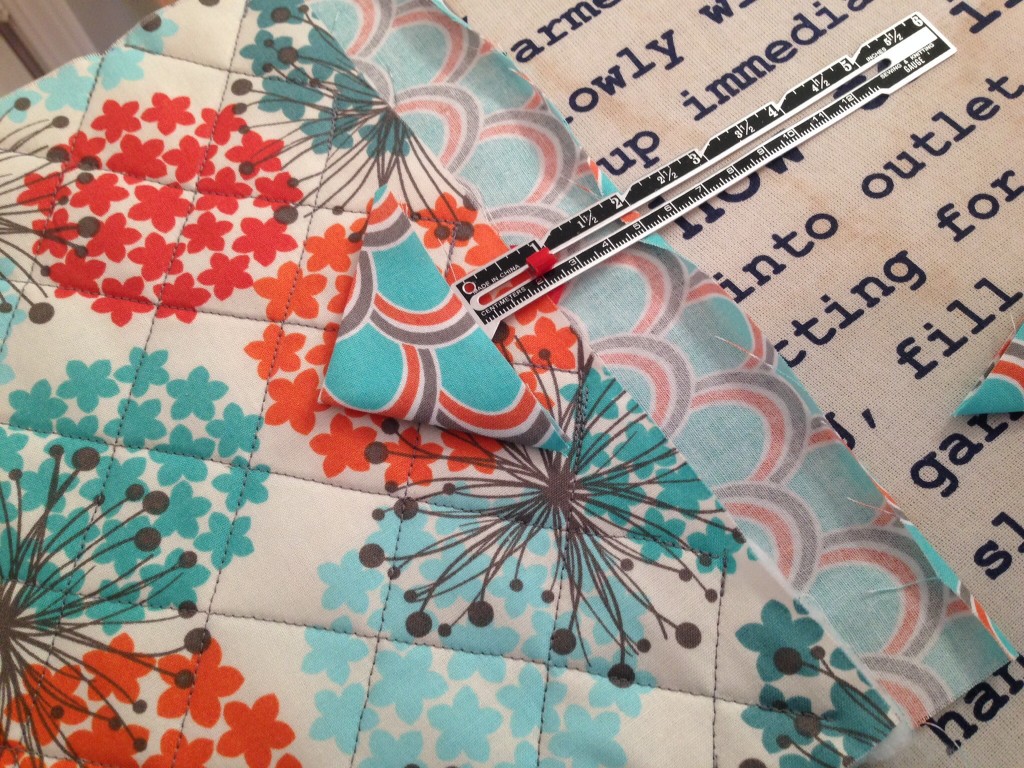 After you have finished quilting, you need to measure the lining material again.  Sometimes it will shift when you quilt it, so pay attention here!  If you have 1 3/4″ hanging off each edge, you need to fold over 1/2″ and press.  If you have 1 1/2″ hanging off each edge, you need to fold over 1/4″ and press.  Basically, when you go to fold over your casing, you need at LEAST 1 1/4″ before you sew it down for the measuring tape to fit in it!