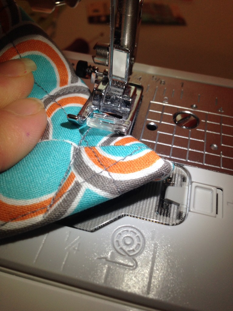 This next part is kind of tricky and is hard to explain, so check out the pictures if you are unsure.  You need to flatten the bottom part of the bag with the bag still inside out.  Pinch the corner and sew a line across where it looks like a small triangle.  This will make your bag sit up a bit!
