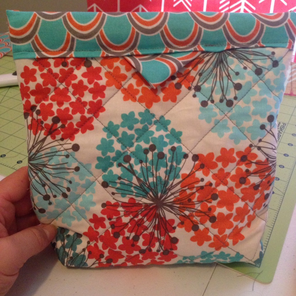 Flip the bag inside out and create a french seam by sewing 1/4″ down each side.  This will encase the raw edge and makes it look nice and finished!