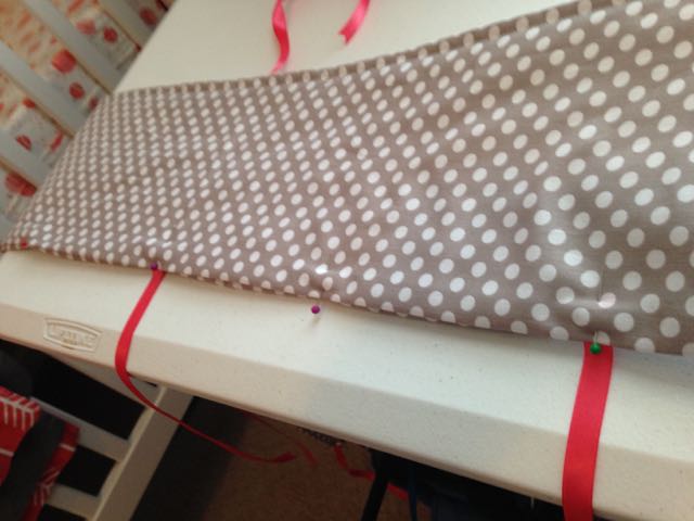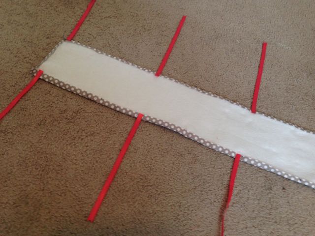Figure out where your ribbon ties need to be placed.  I spaced mine out in between every third rail. Be sure they are placed in at least 1/2 inch to make sure they get sewn in!  Place another ribbon parallel on the other side.