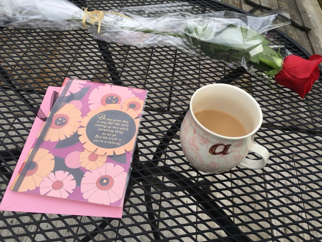 Alex and I had coffee on the porch, where I walked out to a rose and card.