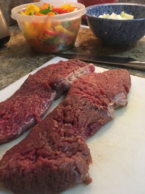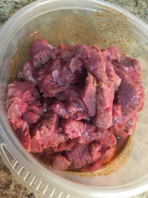 This recipe can be substituted with regular steak, which would be delicious as well. What I like about this recipe is that I can get everything cut earlier in the day and have it ready to put together when I am ready to make supper.