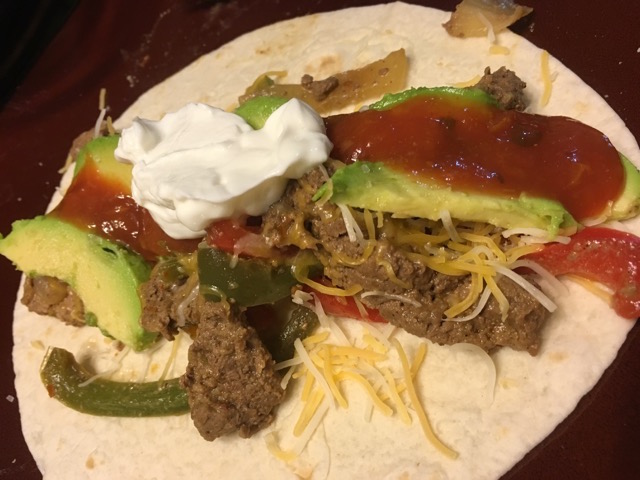 I had already sliced up my peppers and onions before I decided to do a blogpost on this, so here is everything prepped as I get ready to slice up my tenderized round steak.I make a little marinade with olive oil, chili powder, cayenne, garlic powder, red chili flakes, salt, and pepper. I don’t really measure anything and just give it a good stir.Toss in your steak slices.Put a lid on, give it a good toss, throw it in the fridge and forget about it for a few hours!I sauté’ the veggies first with a little olive oil and garlic powder. I usually use minced garlic, but we were out. The tenderized round steak cooks pretty cook, so don’t throw that in before the veggies are soft or it will be way too tough.Add the tenderized round steak and cook until done. Don’t they look yummy?So good! I was even being good, as I used greek yogurt instead of sour cream!I will leave you with my adorable daughter sharing her quesadilla tonight. First with daddy…And then with mommy from across the table! My heart is so full!